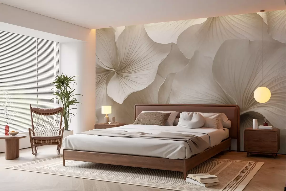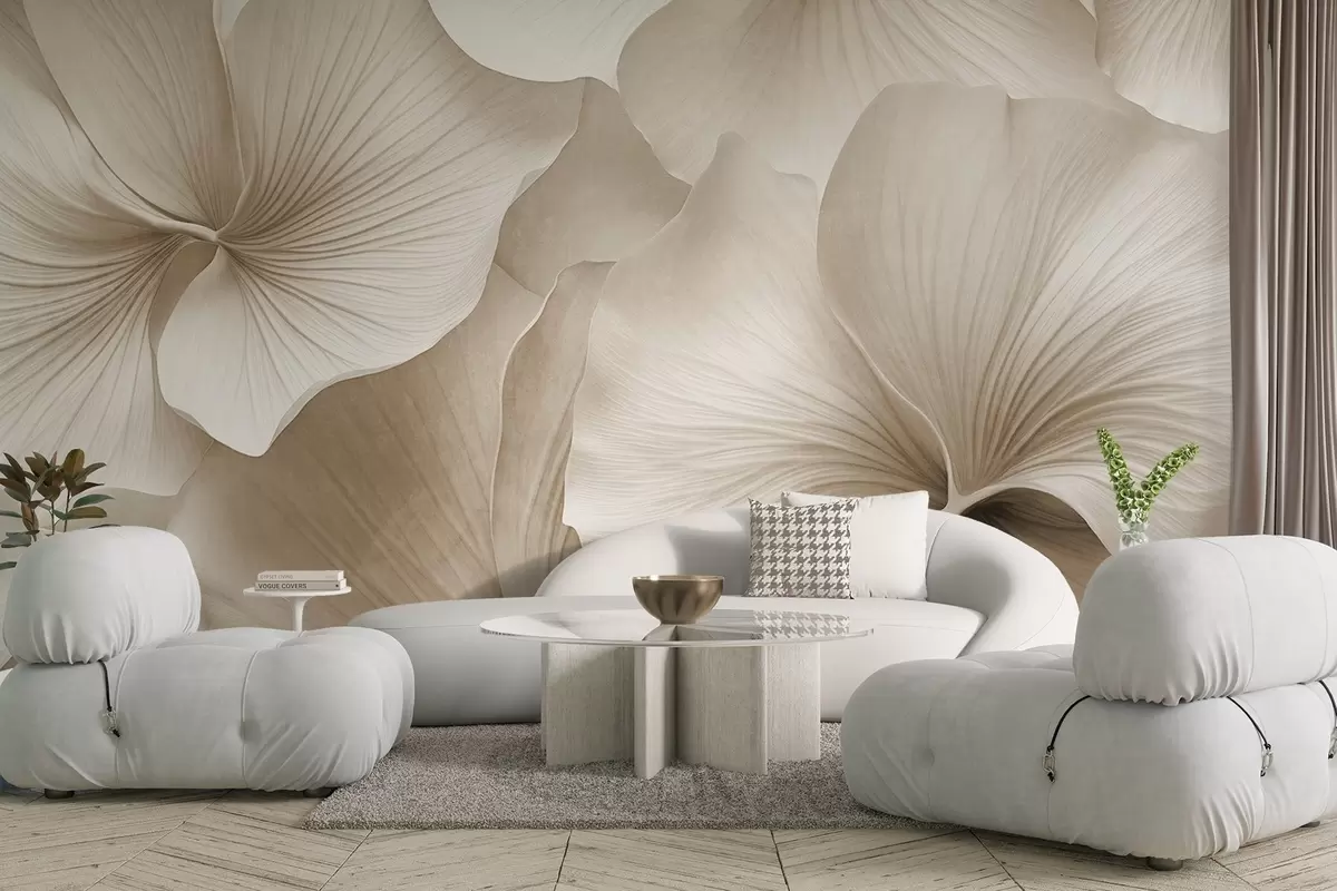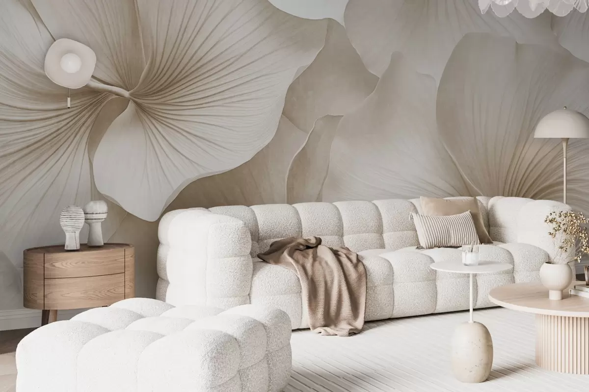 Papier peint Feuilles de ginkgo blanches et beiges, texture douce, fond floral abstrait, style minimaliste moderne N° w09421v1