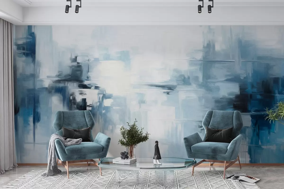 Papier peint Imitation de peinture abstraite texturée représentant un paysage, avec des coups de pinceau bleus et blancs, style moderne N° w09422
