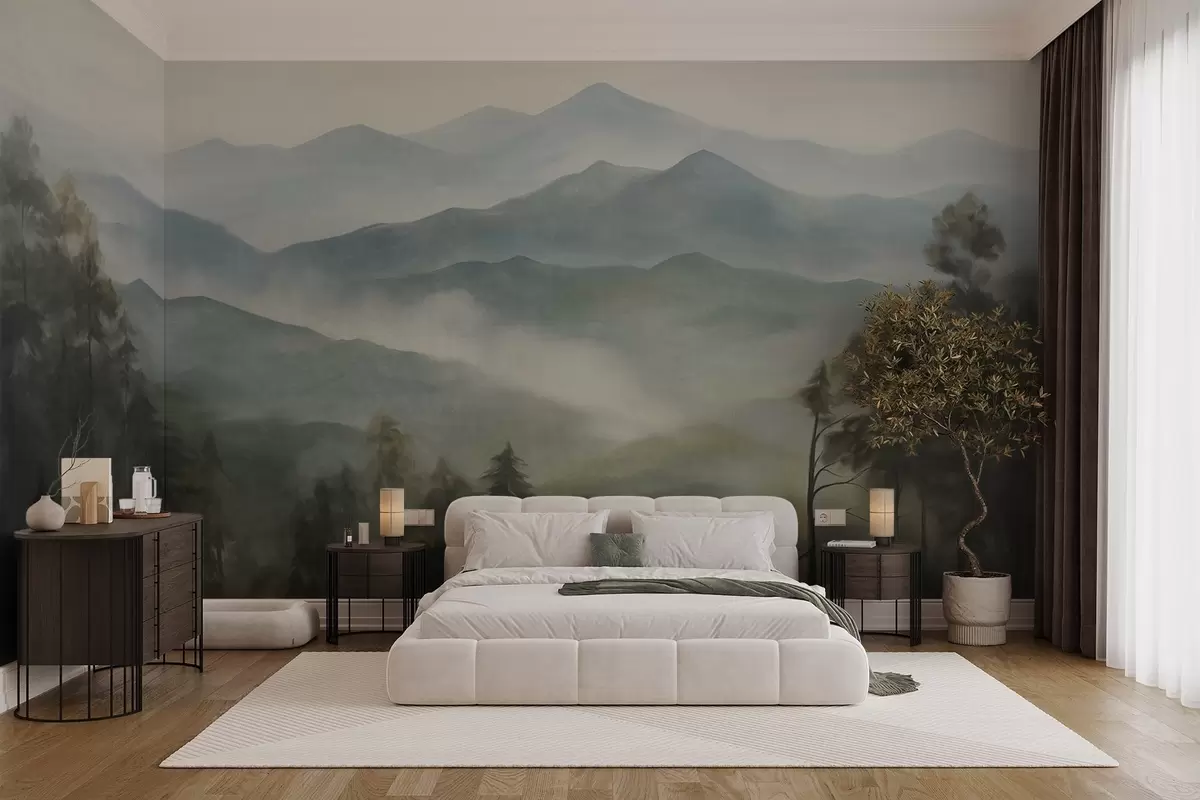 Papier peint Chaîne de montagnes brumeuse avec des arbres, du brouillard, un ciel nuageux, des couleurs sourdes, style peinture paysagère N° w09424