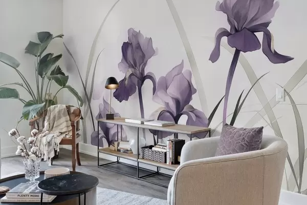 Papier peint Fleurs d'iris violettes avec tiges vertes, style aquarelle, fond blanc, couleurs douces, élégant, artistique N° w09425