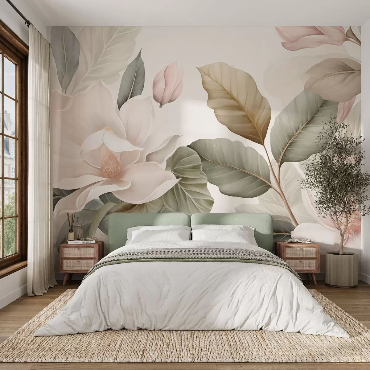 Papier peint Fleurs de magnolia avec des feuilles aux couleurs pastel, blanches, roses et vertes, douces, délicates, style aquarelle N° w09427