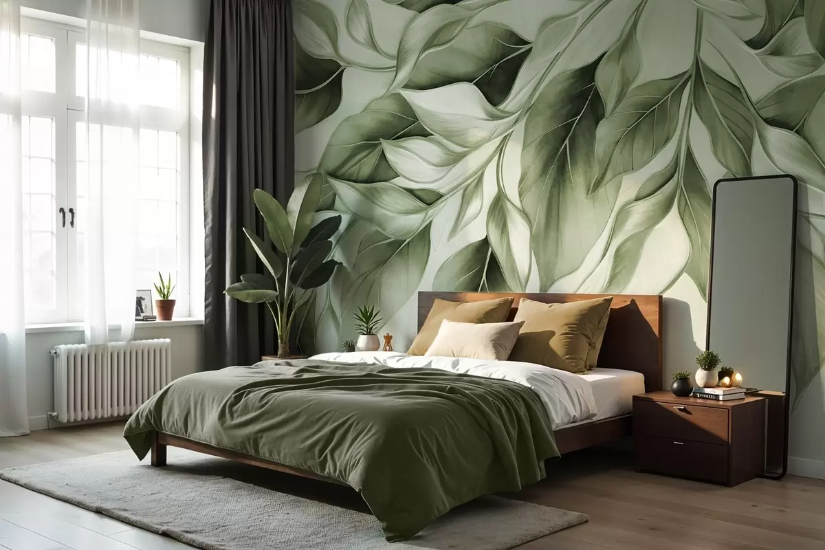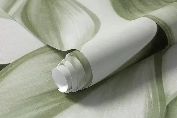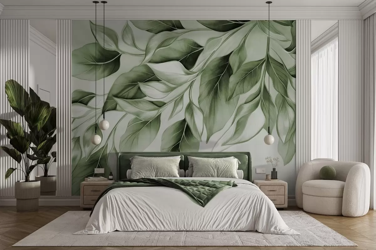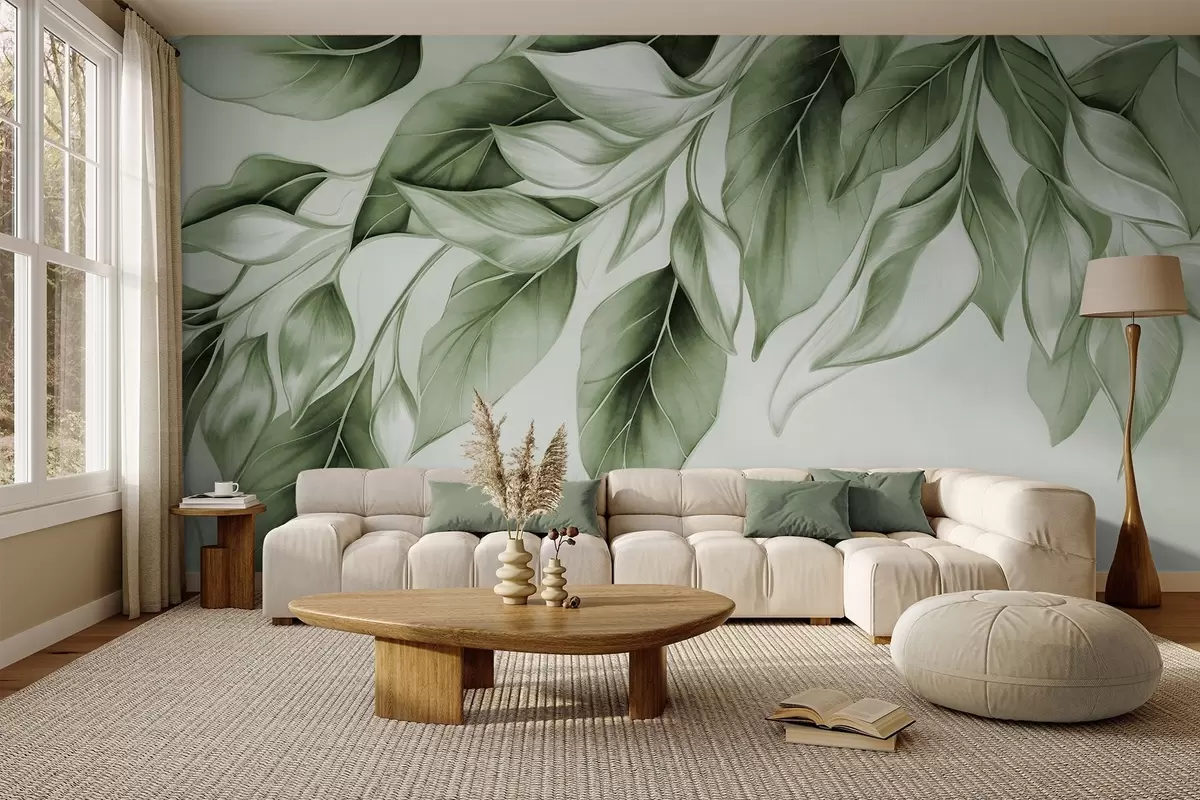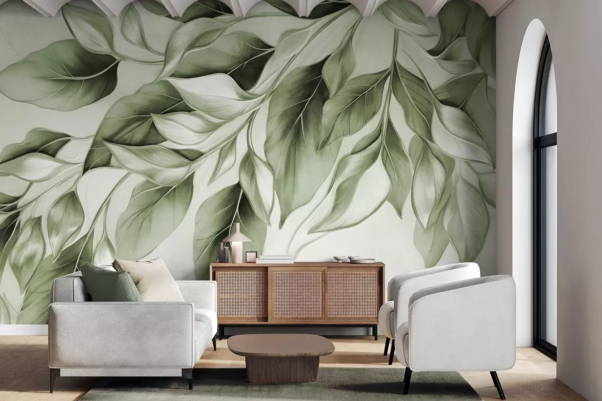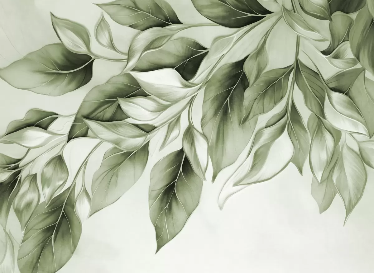 Papier peint Feuilles vertes texturées et discrètes, fond clair, design élégant et artistique, style moderne N° w09429v1