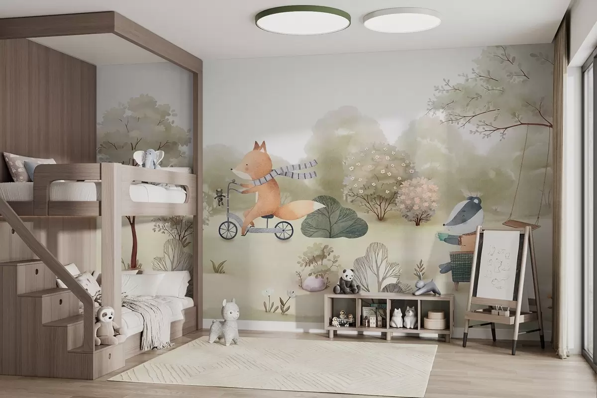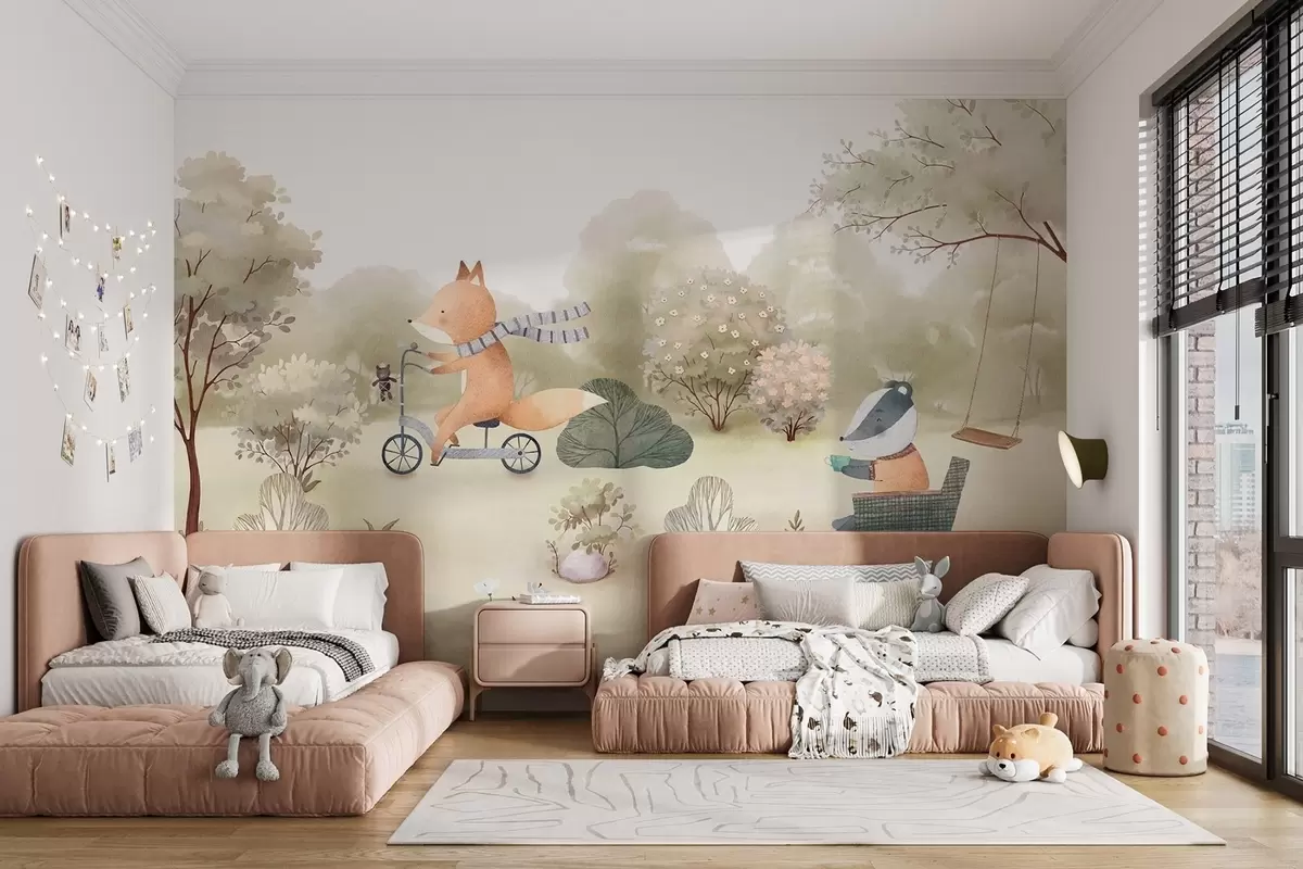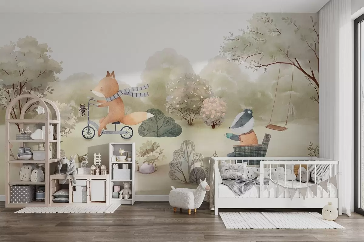 Papier peint Renard à vélo et blaireau avec du thé, animaux de la forêt peints à l'aquarelle N° w09439