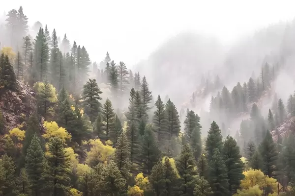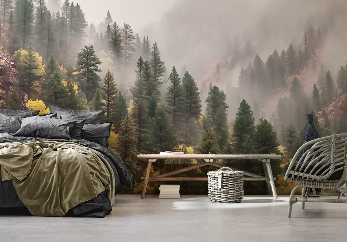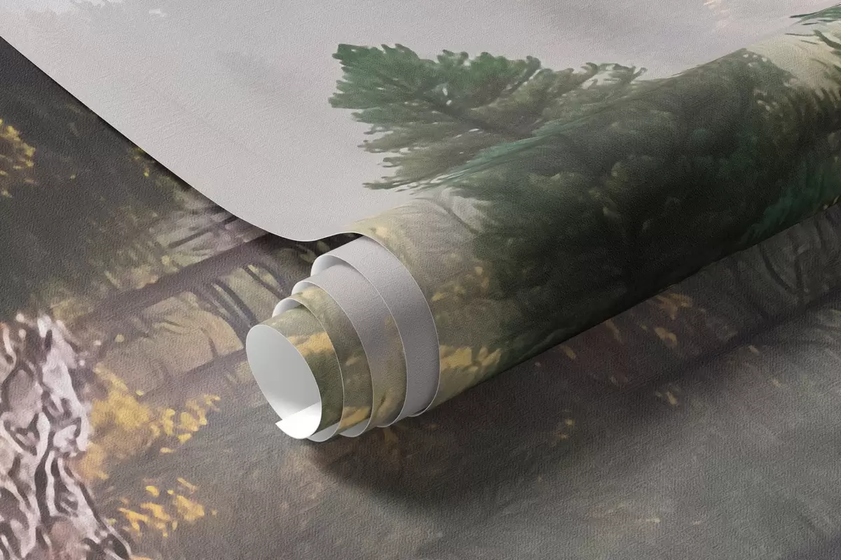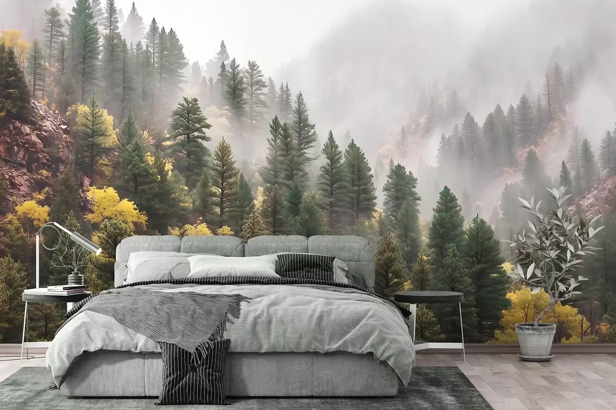 Papier peint Forêt de pins brumeuse et atmosphérique dans les montagnes N° w09463