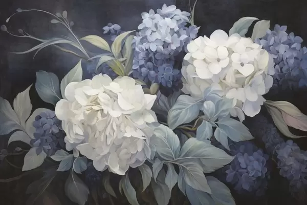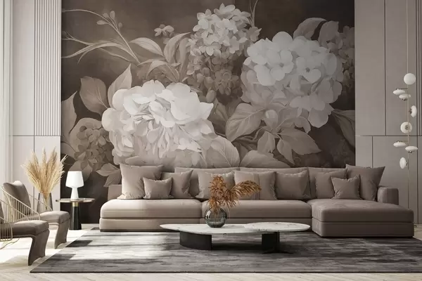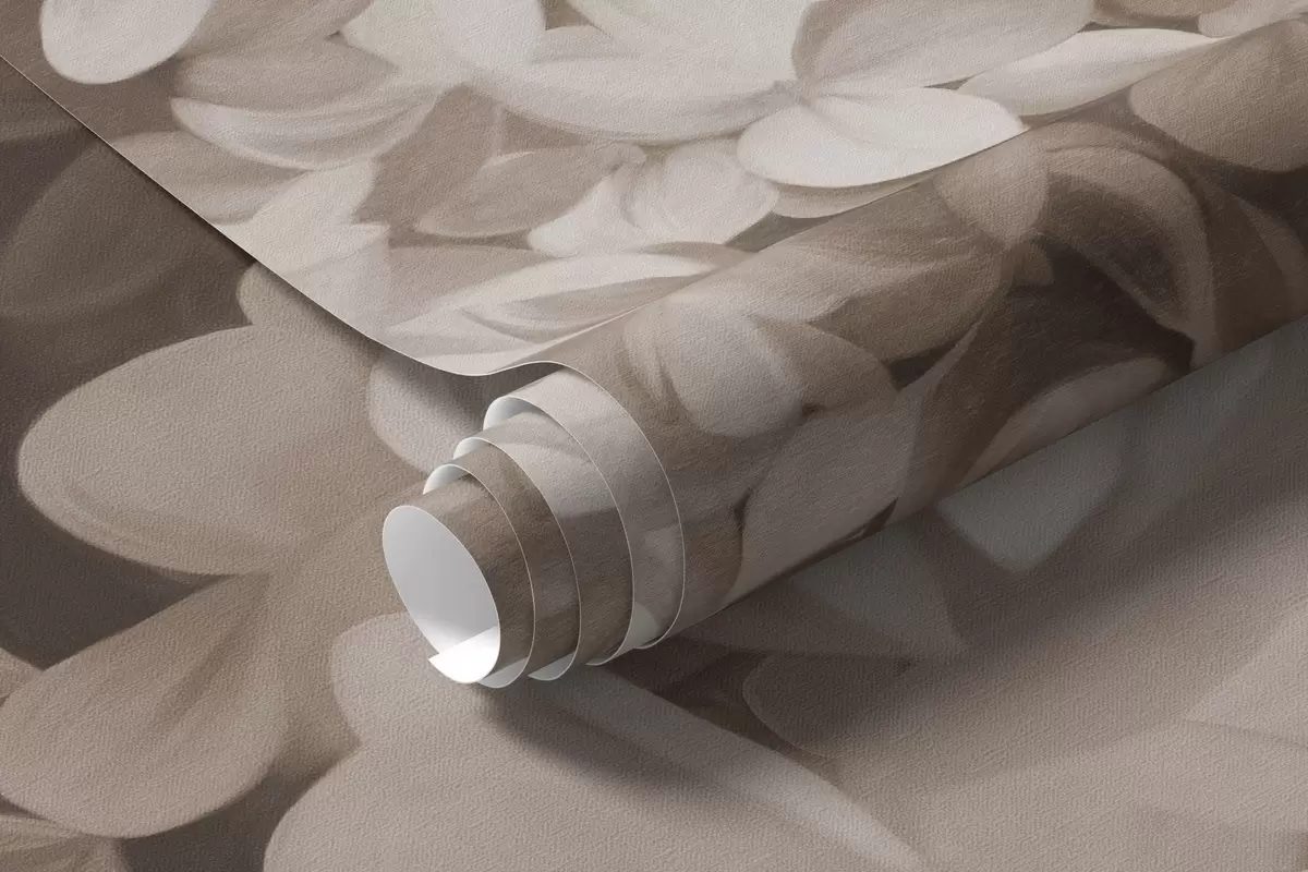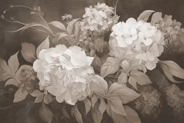 Papier peint Peinture sépia texturée imitant des fleurs d'hortensias à grandes feuilles, sur fond abstrait et sombre N° w09465