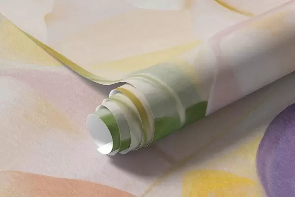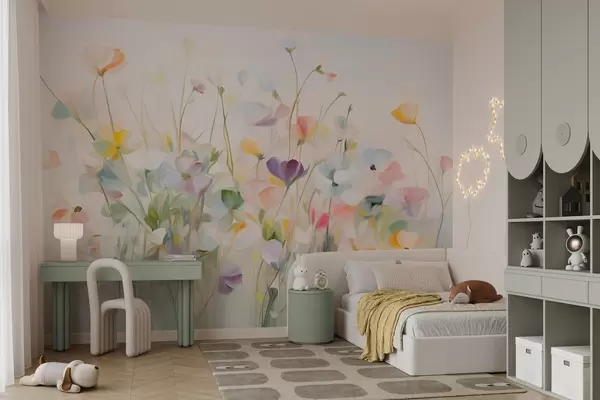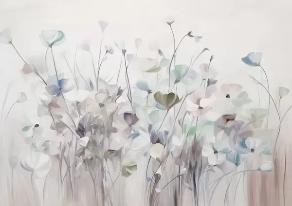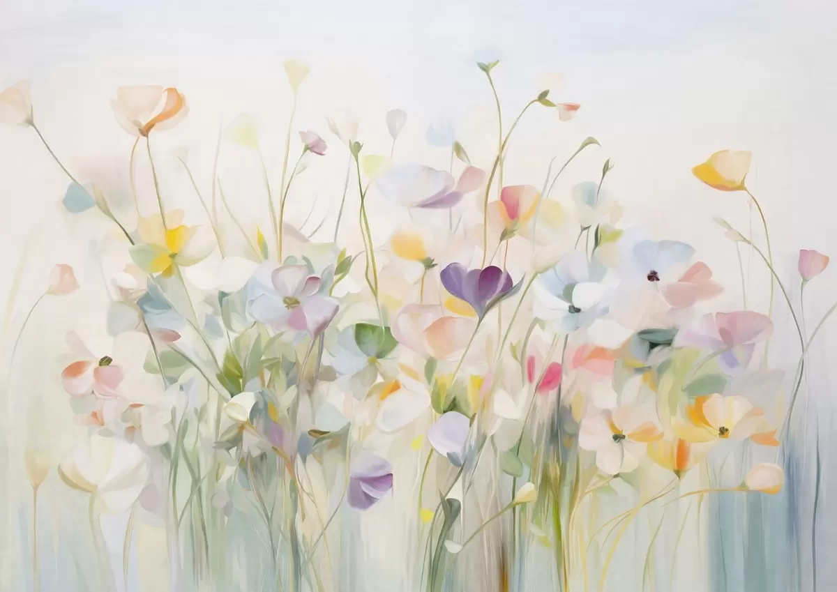 Papier peint Champ abstrait de fleurs colorées à longues tiges et feuilles vertes, texturé, couleurs pastel et claires N° w09466