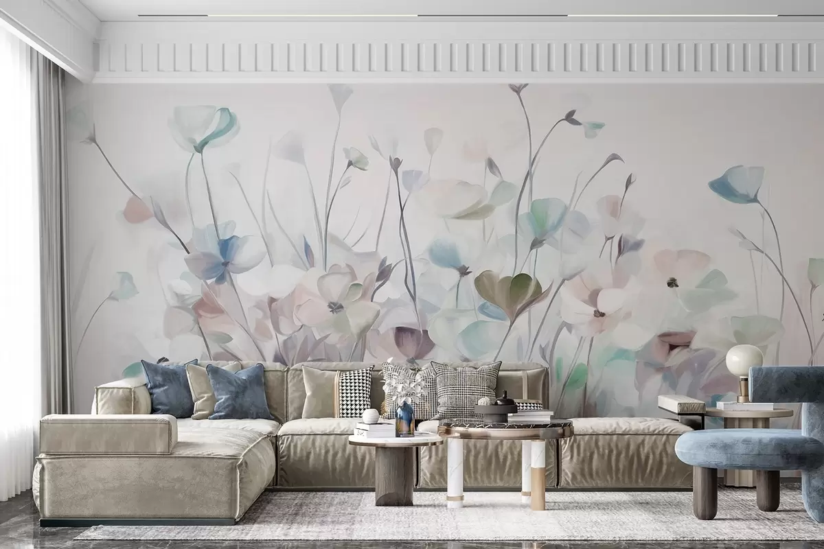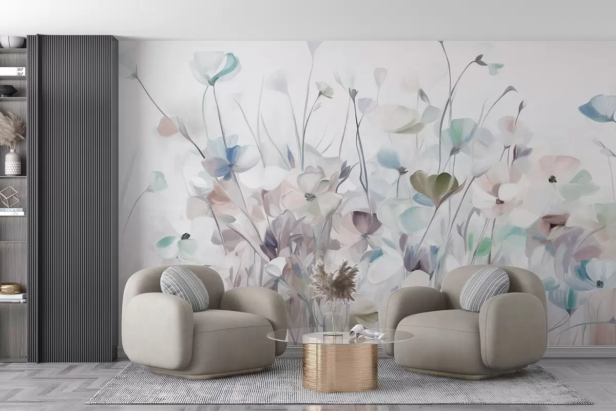 Papier peint Champ abstrait de fleurs bleues et brunes avec de longues tiges et feuilles, texturé, couleurs pastel et douces N° w09466v1