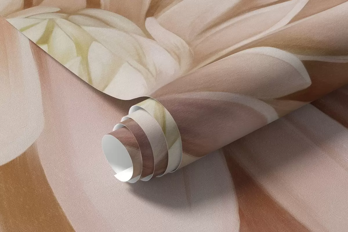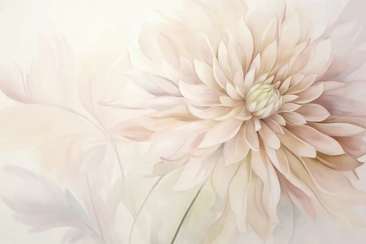 Papier peint Une fleur de dahlia rose pâle aux nombreux pétales, sur un fond pastel à la texture douce avec des touches de vert et de beige N° w09470