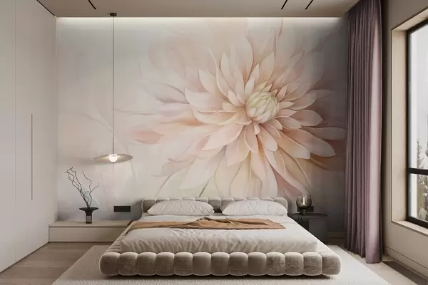 Papier peint Une fleur de dahlia rose pâle aux nombreux pétales, sur un fond pastel à la texture douce avec des touches de vert et de beige N° w09470