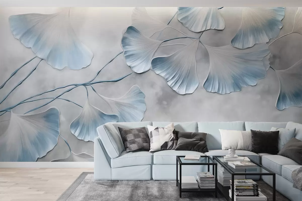 Papier peint Feuilles de ginkgo biloba aux bords bleus sur une branche, fond texturé gris, design élégant et minimaliste N° w09472v1