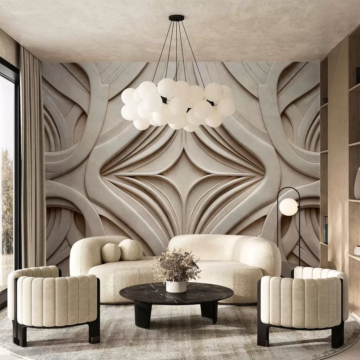 Papier peint Imprimé géométrique abstrait symétrique texturé, couleur beige clair, style art déco, détails complexes N° w09473