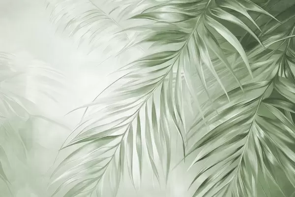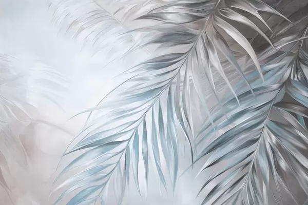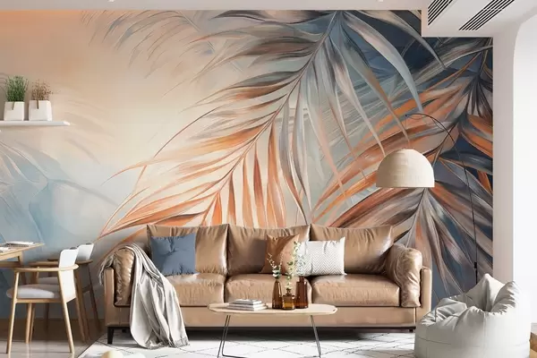 Papier peint Feuilles de palmier aux tons orange et bleu, fond légèrement texturé aux couleurs douces, style tropical élégant N° w09475