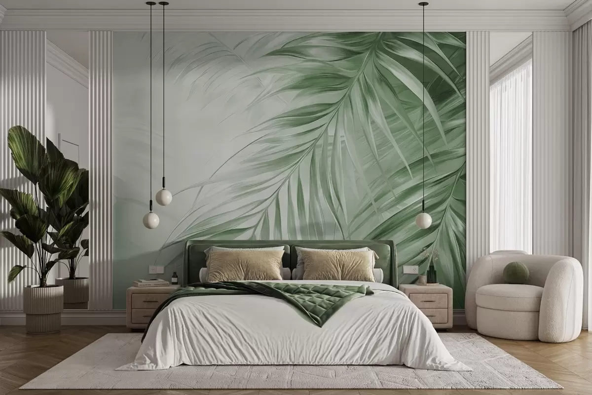 Papier peint Feuilles de palmier aux tons verts, fond légèrement texturé aux couleurs douces, style tropical élégant N° w09475v2