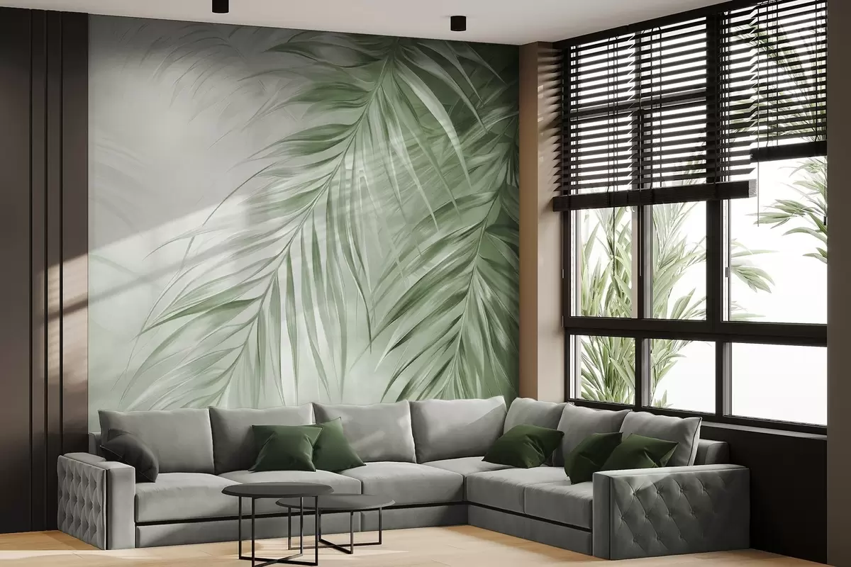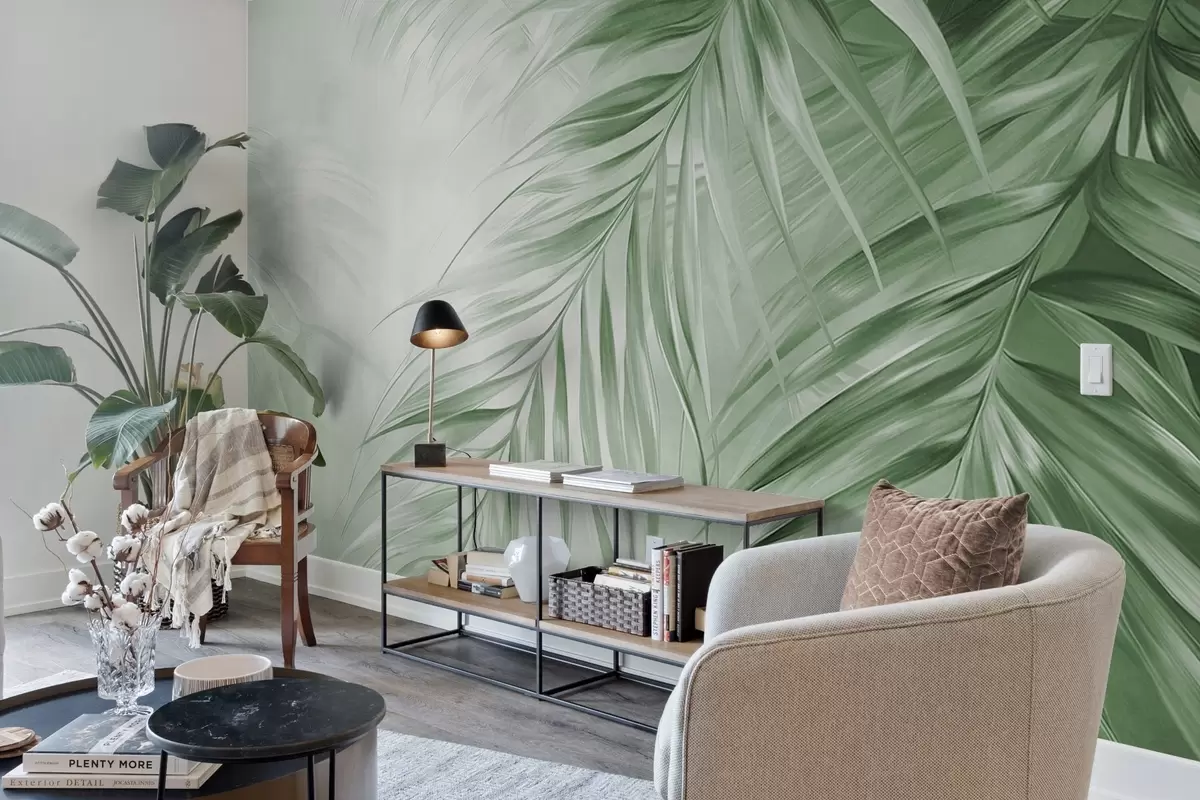 Papier peint Feuilles de palmier aux tons verts, fond légèrement texturé aux couleurs douces, style tropical élégant N° w09475v2