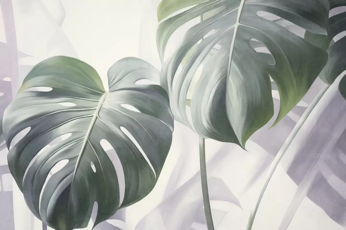 Papier peint Feuilles de monstera texturées, grandes et vertes, sur un fond abstrait doux et clair. N° w09477