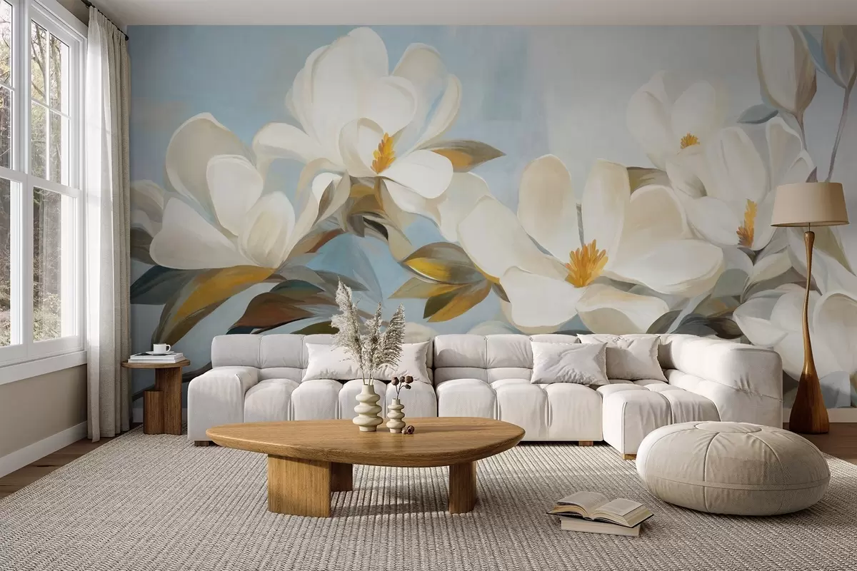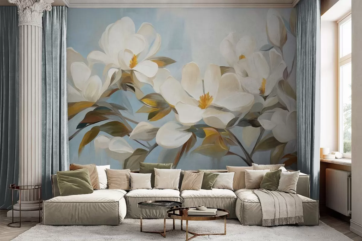 Papier peint Magnolias blancs avec feuilles vertes sur fond bleu clair avec imitation de coups de pinceau abstraits N° w09478
