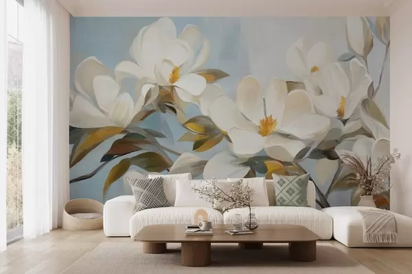 Papier peint Magnolias blancs avec feuilles vertes sur fond bleu clair avec imitation de coups de pinceau abstraits N° w09478