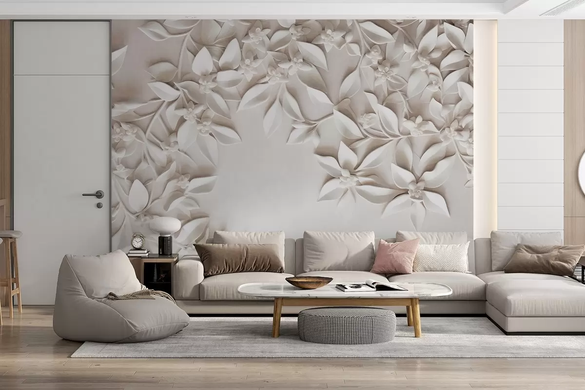 Papier peint Fleurs et feuilles blanches texturées, composition florale, design élégant, style minimaliste, art décoratif N° w09479