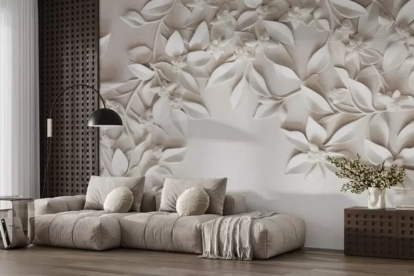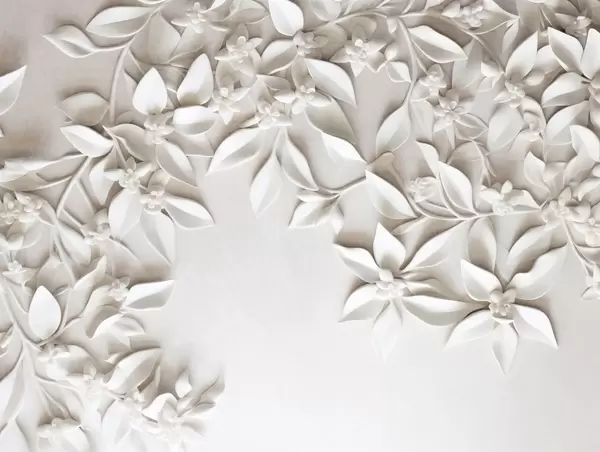 Papier peint Fleurs et feuilles blanches texturées, composition florale, design élégant, style minimaliste, art décoratif N° w09479