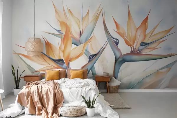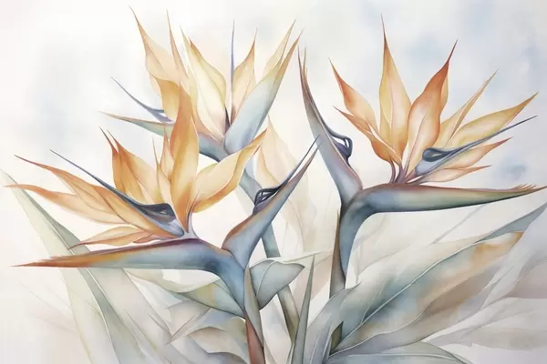 Papier peint Fleur d'oiseau de paradis, strelitzia à pétales orange, style aquarelle doux et texturé, fond clair N° w09483