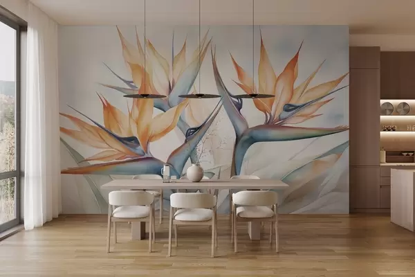 Papier peint Fleur d'oiseau de paradis, strelitzia à pétales orange, style aquarelle doux et texturé, fond clair N° w09483