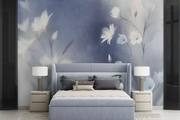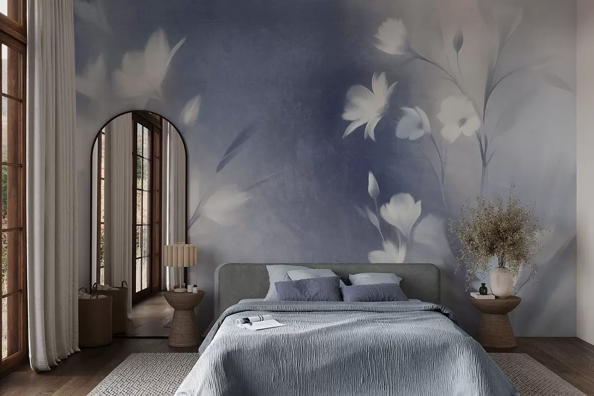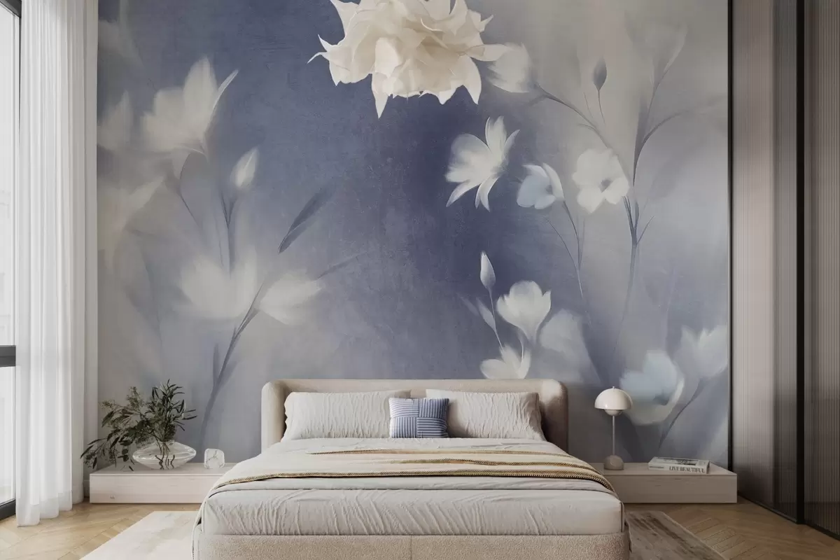 Papier peint Fleurs blanches texturées à longues tiges, boutons délicats sur fond flou aux teintes bleues et blanches N° w09484