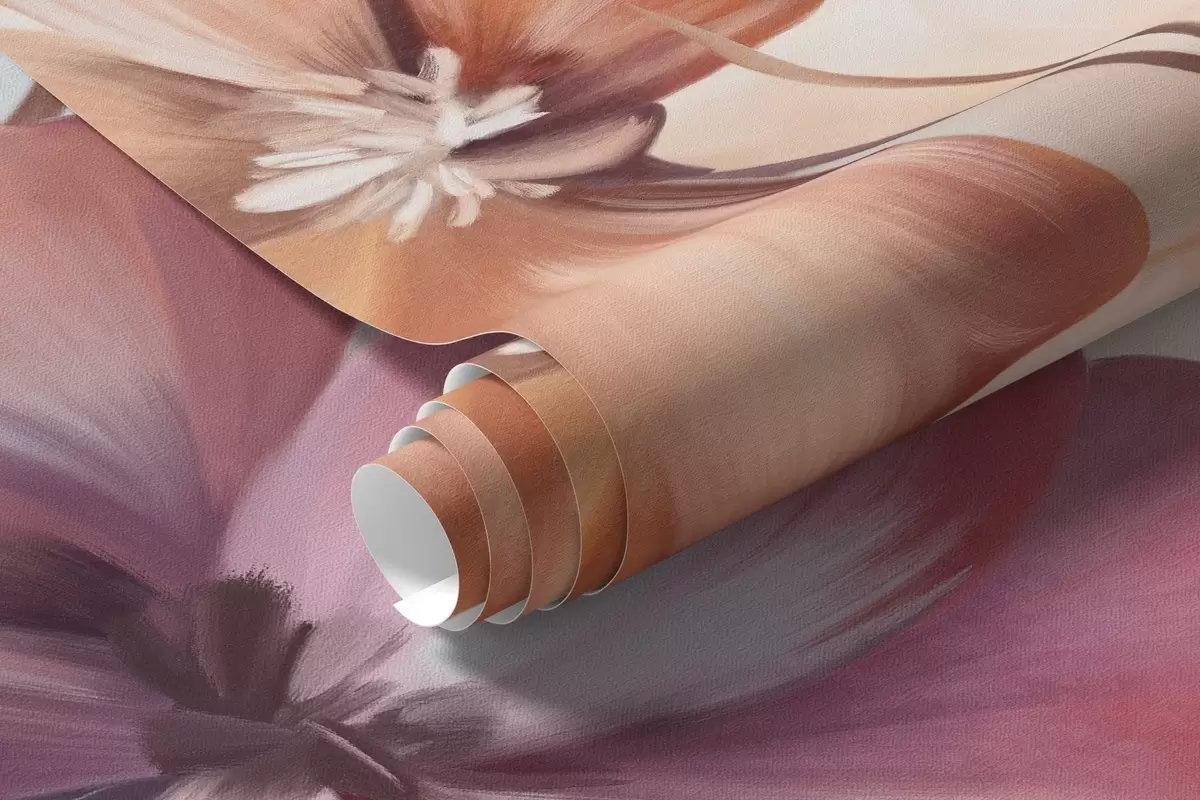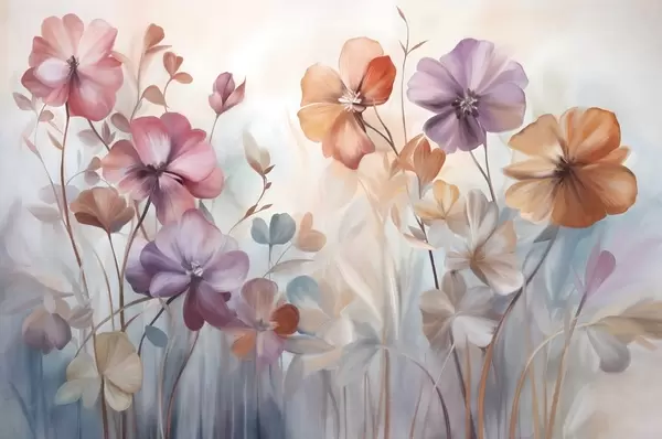 Papier peint Composition florale texturée avec des fleurs roses, violettes et orange, des tiges et des feuilles vertes, dans des tons pastel doux N° w09486