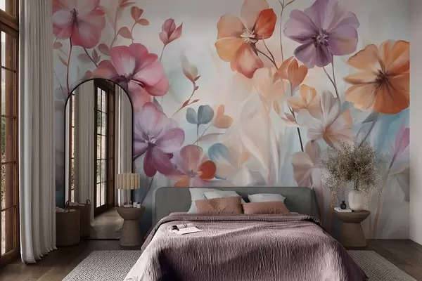 Papier peint Composition florale texturée avec des fleurs roses, violettes et orange, des tiges et des feuilles vertes, dans des tons pastel doux N° w09486