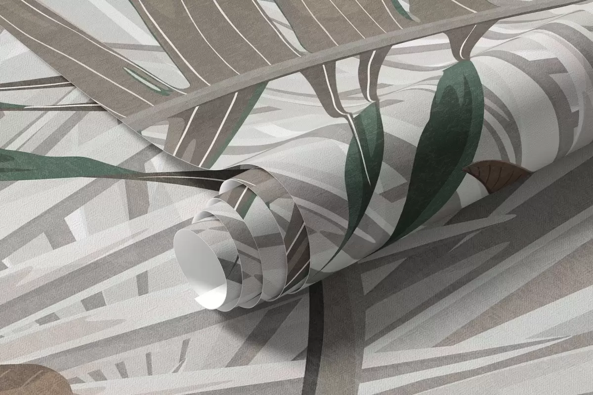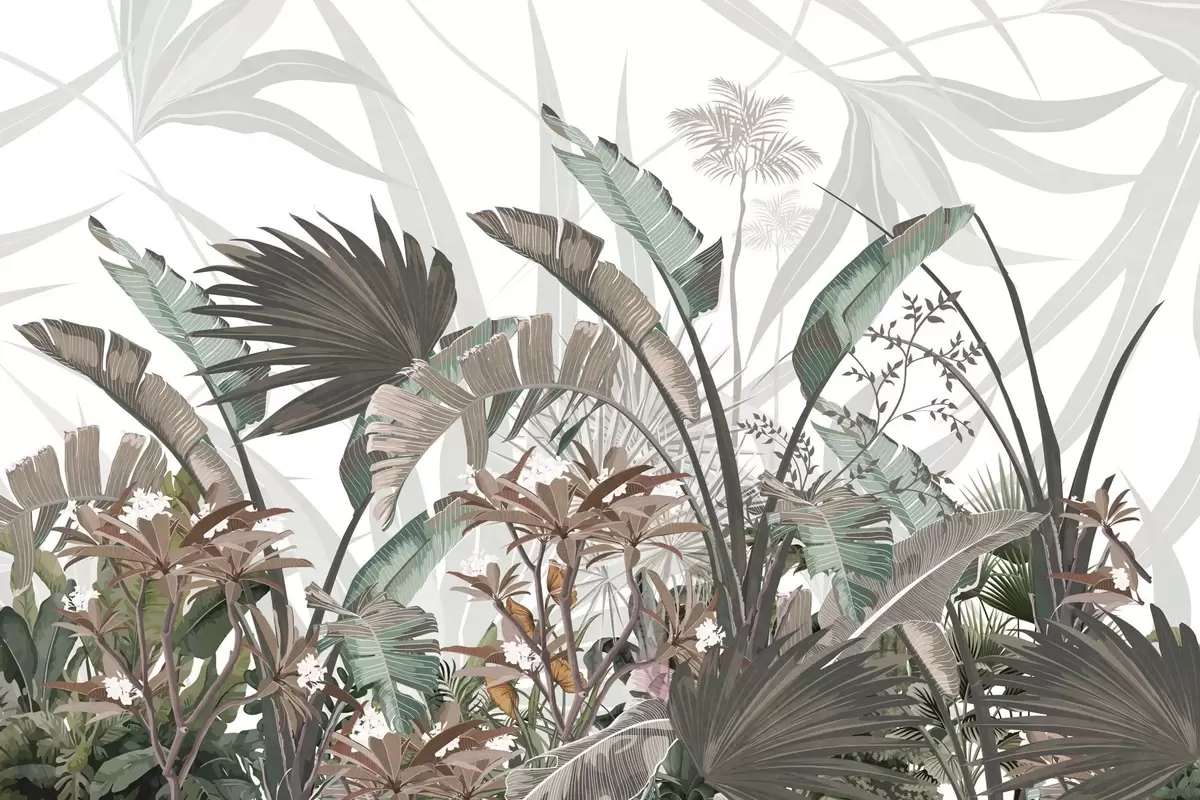 Papier peint Feuilles tropicales texturées avec fleurs, palmiers, fleurs de frangipanier, couleurs pastel, fond blanc, jungle N° w09488