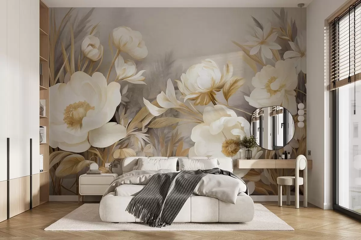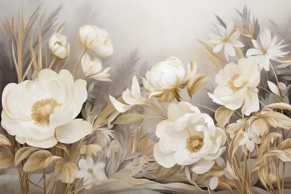 Papier peint Pivoines blanches et jaunes et autres fleurs avec de hautes herbes et des feuilles dans un style doux et pictural. N° w09494