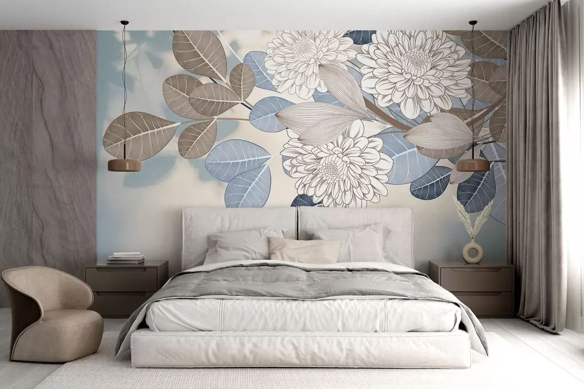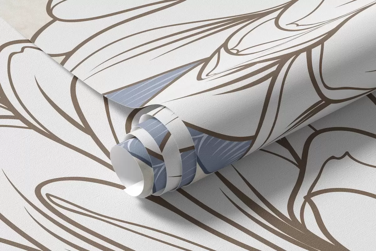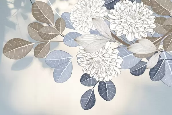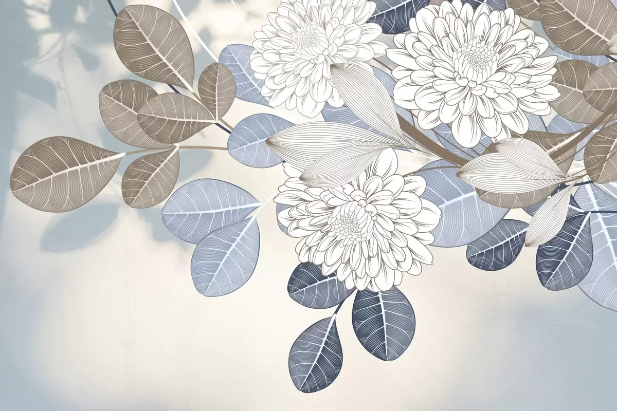 Papier peint Fleurs blanches avec des feuilles bleues et brunes, fond texturé bleu clair, composition florale, dessin au trait détaillé N° w09496