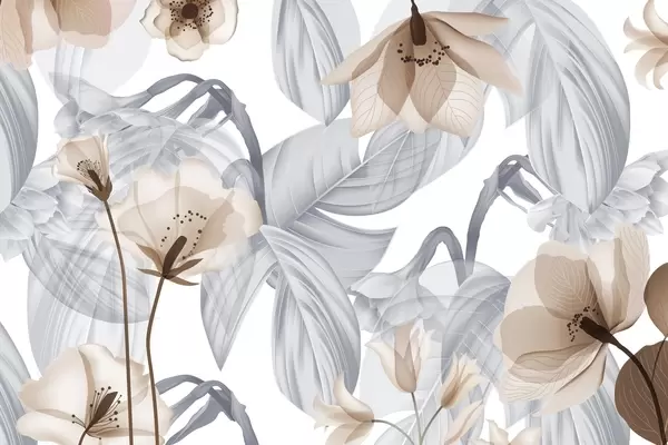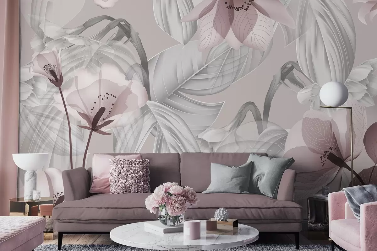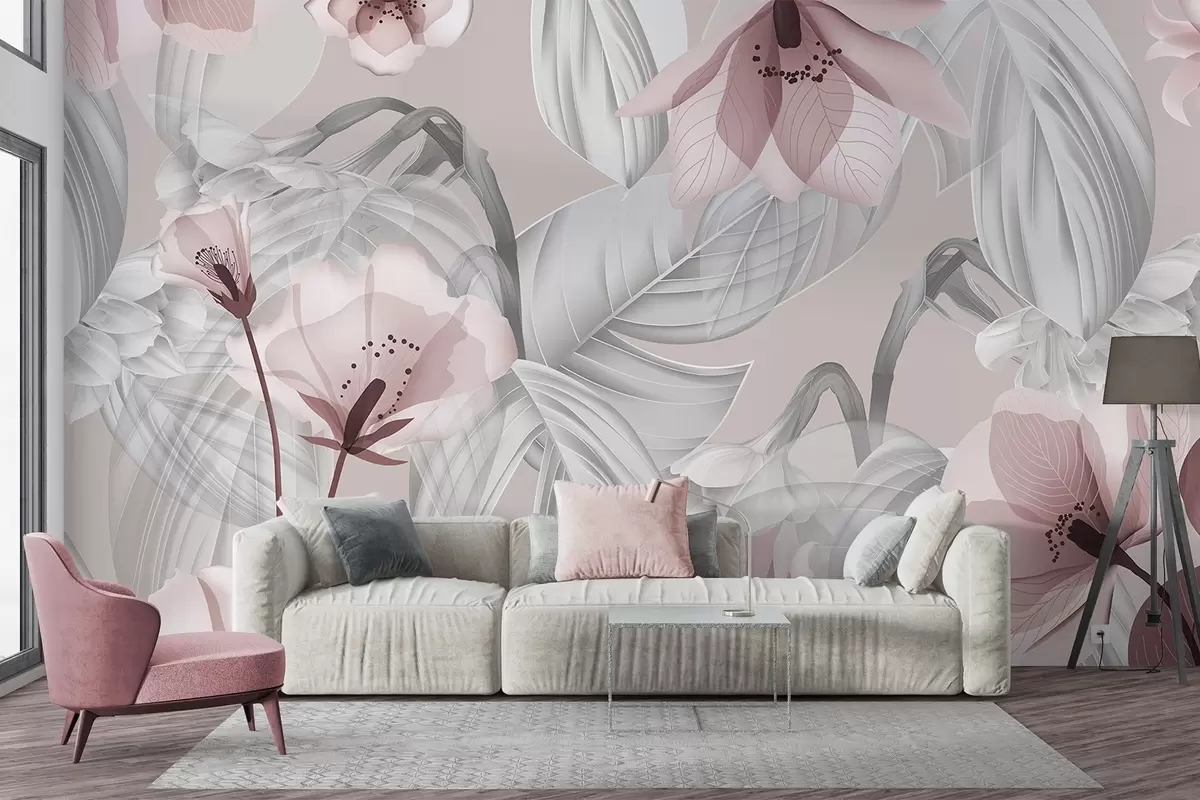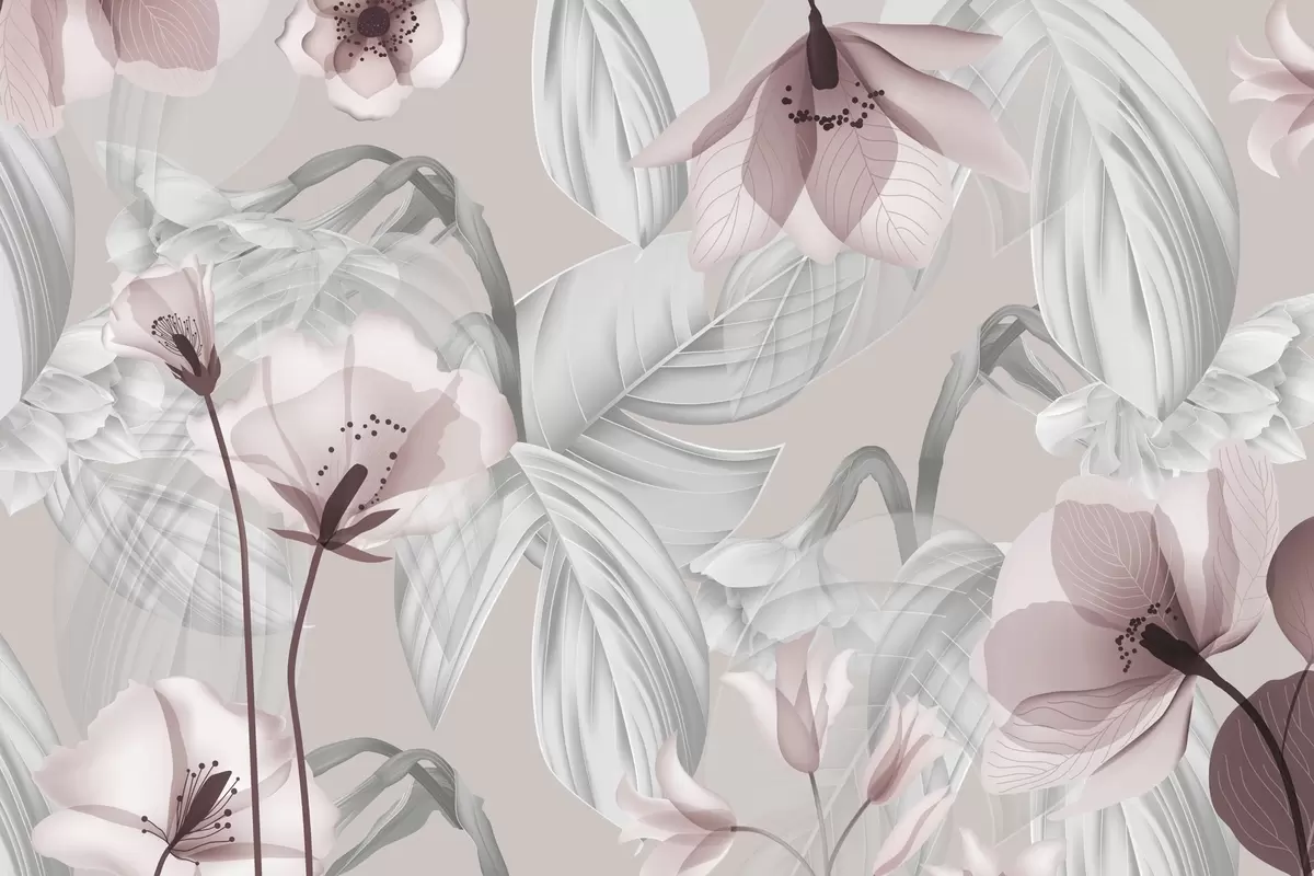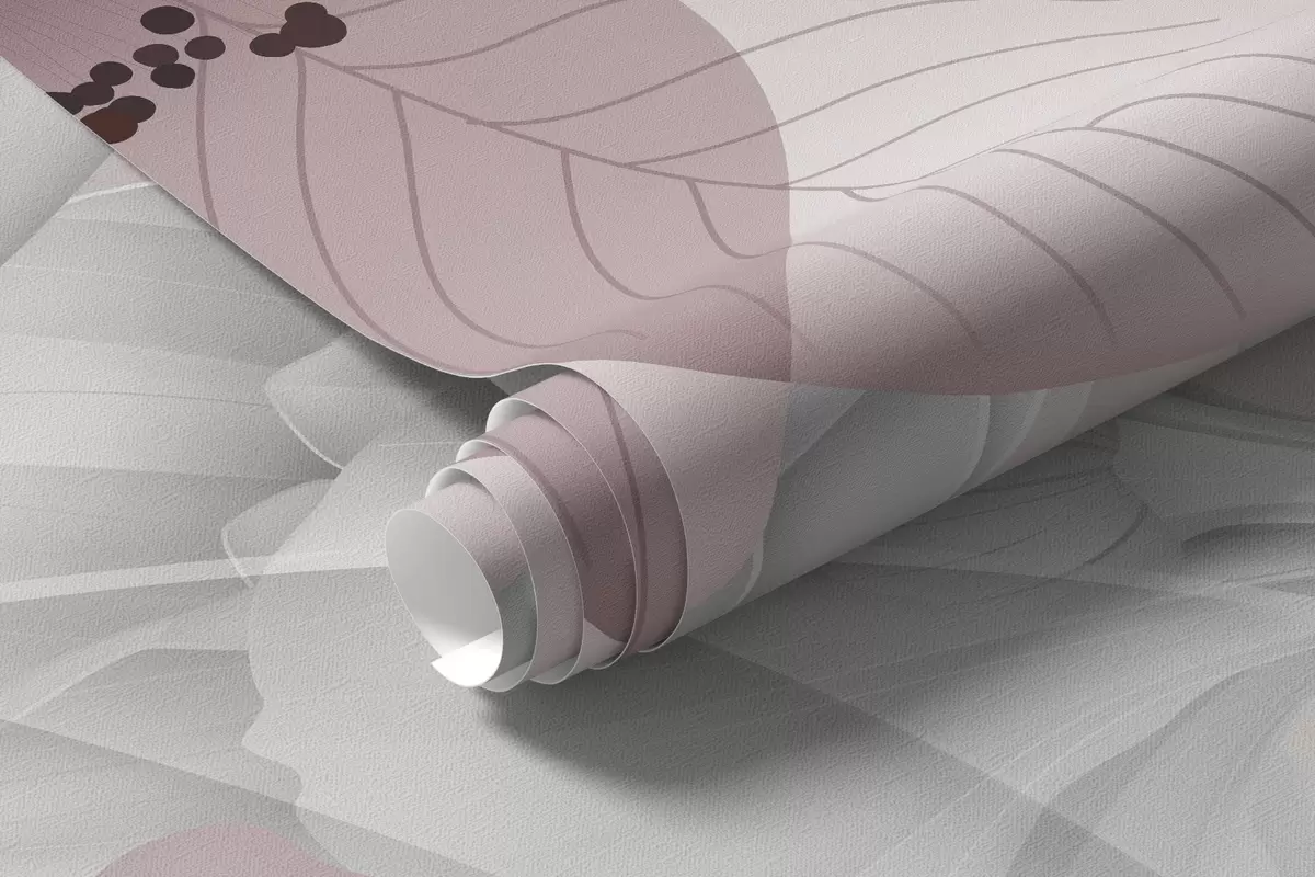 Papier peint Fleurs roses et feuilles grises, fond botanique floral, design élégant, couleurs douces, détails légers et délicats N° w09497