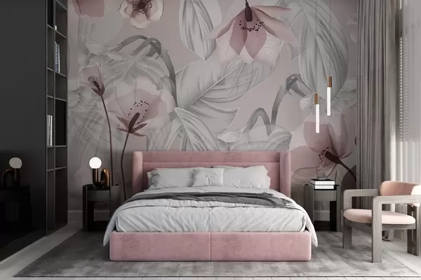 Papier peint Fleurs roses et feuilles grises, fond botanique floral, design élégant, couleurs douces, détails légers et délicats N° w09497