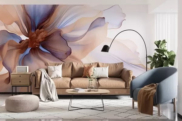 Papier peint Fleur détaillée à grande texture avec des pétales blancs, bleus et bruns, sur fond blanc w09498