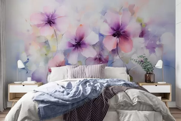 Papier peint Fleurs printanières aquarellées dans des tons roses et violets w09502