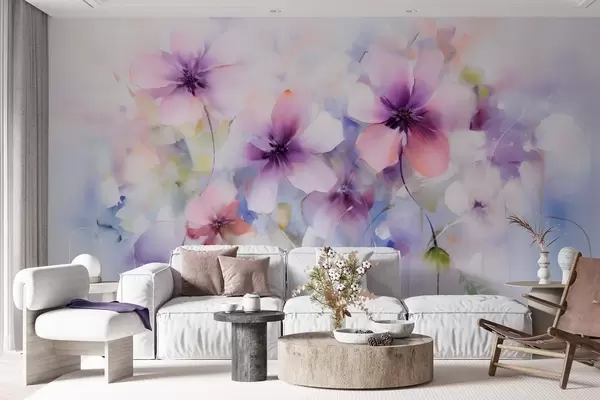 Papier peint Fleurs printanières aquarellées dans des tons roses et violets N° w09502
