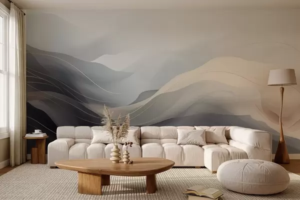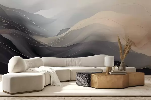 Papier peint Vagues abstraites brumeuses dans des tons gris-crème avec des lignes jaunes N° w09504