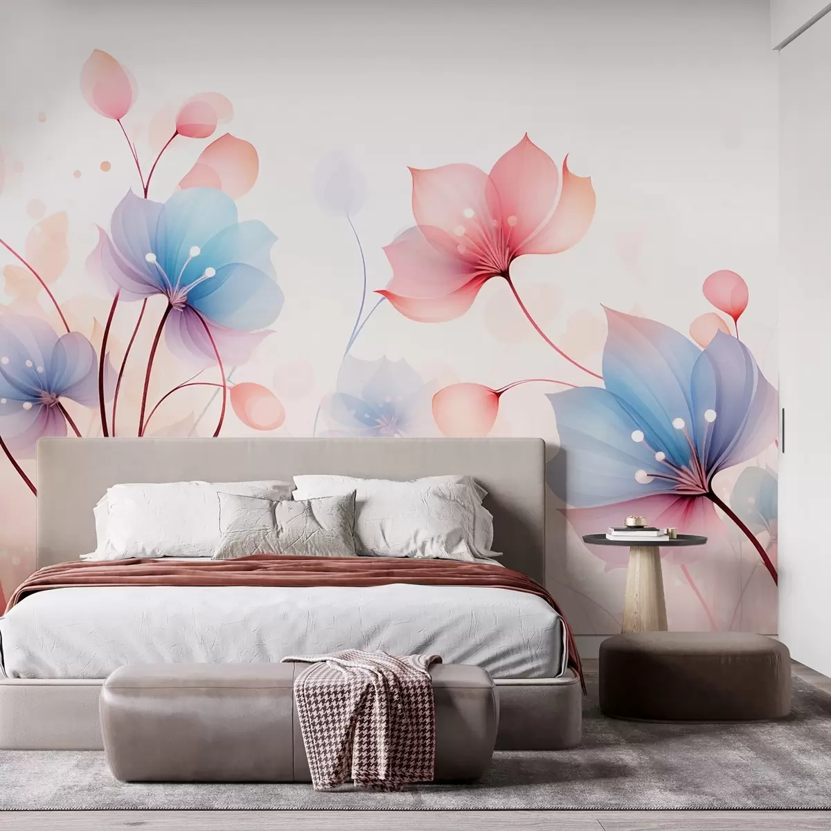 Papier peint Fleurs délicates rose-bleu — flore aérienne sur fond aquarelle blanc N° w09507