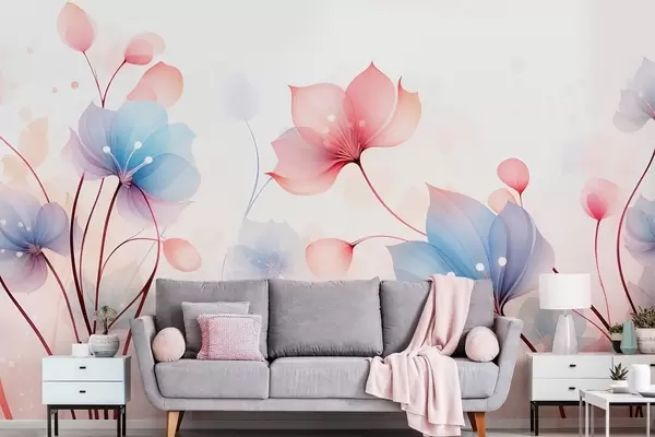 Papier peint Fleurs délicates rose-bleu — flore aérienne sur fond aquarelle blanc N° w09507