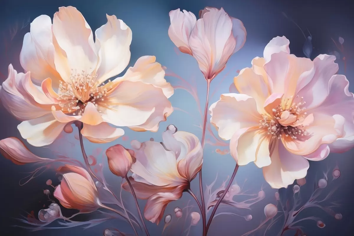 Papier peint Pivoines rose pâle et crème, peintes à l'aquarelle sur fond bleu foncé N° w09513