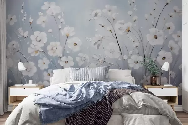 Papier peint Fleurs blanches sur fond de ciel bleu dans un style peinture à l'huile N° w09516