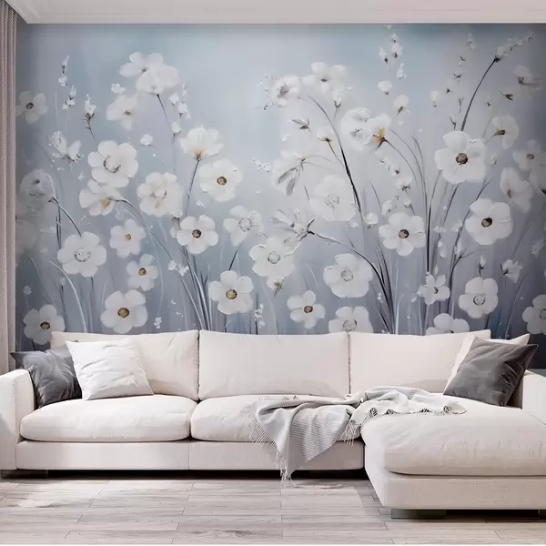 Papier peint Fleurs blanches sur fond de ciel bleu dans un style peinture à l'huile N° w09516