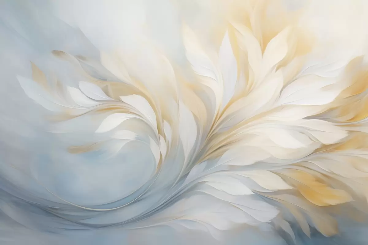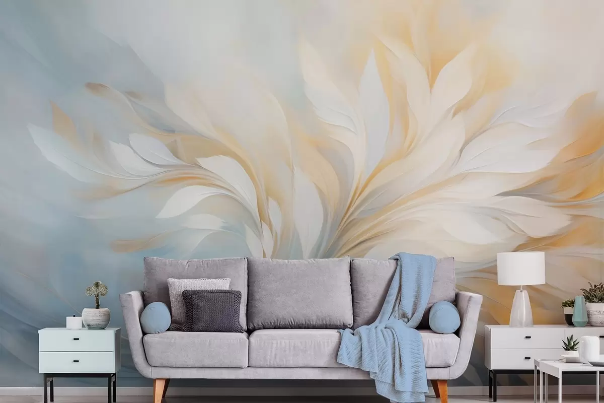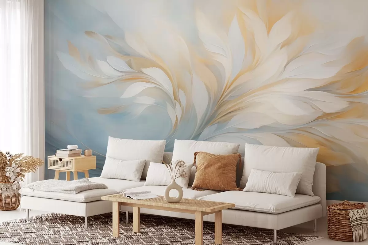 Papier peint Composition abstraite de formes lisses ressemblant à des plumes dans des tons jaunes et bleus N° w09525