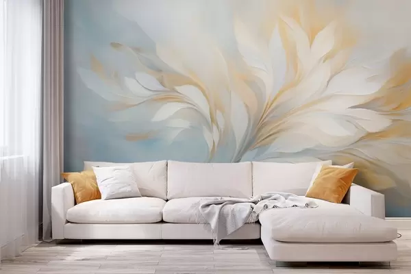 Papier peint Composition abstraite de formes lisses ressemblant à des plumes dans des tons jaunes et bleus N° w09525