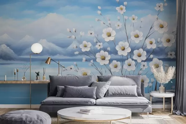 Papier peint Fleurs blanches printanières au bord d'un lac gelé avec des montagnes enneigées, dans un style peinture à l'huile N° w09526