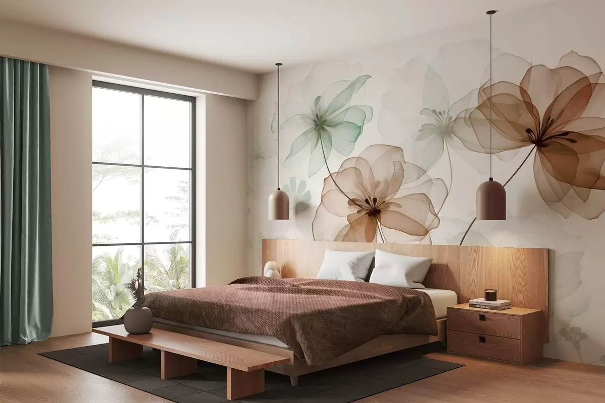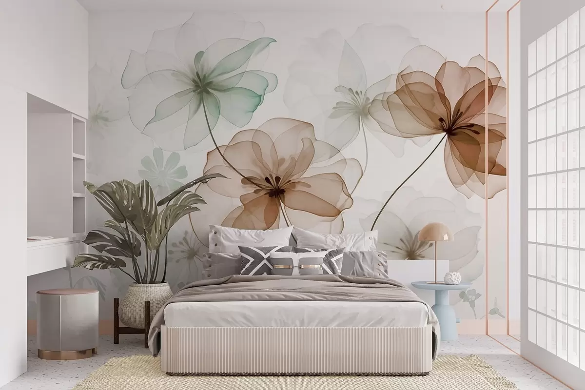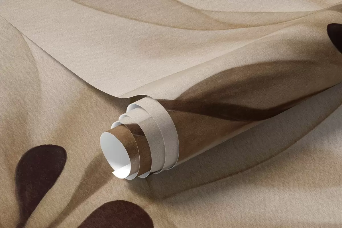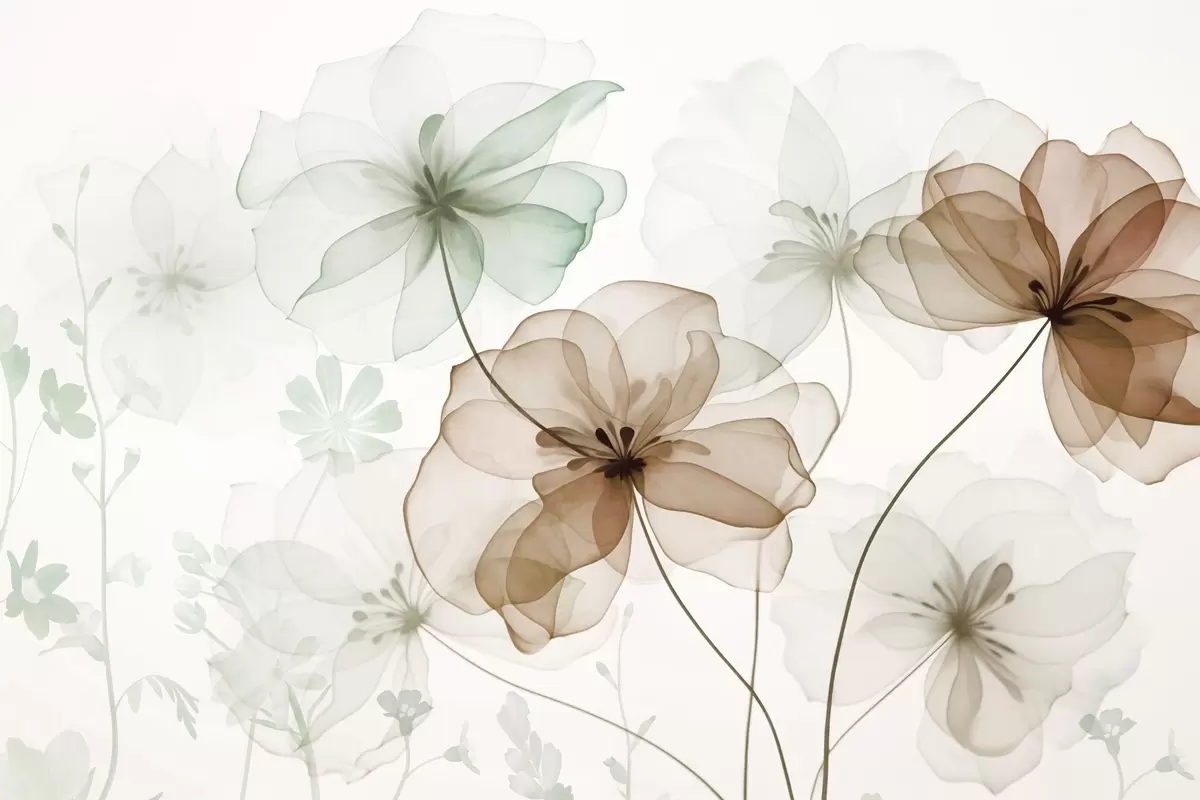 Papier peint Fleurs translucides aux pétales bruns et verts, longues tiges, fond clair, couleurs douces, motif floral texturé N° w09529