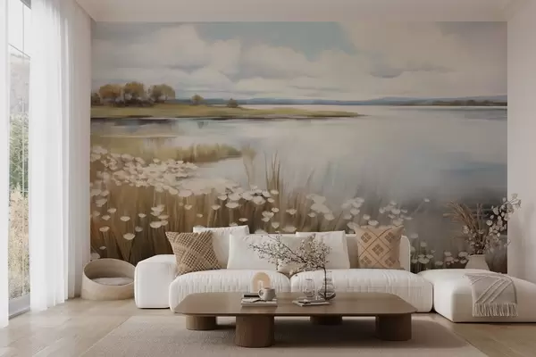 Papier peint Paysage texturé, champ de fleurs blanches et d'herbes hautes, lac en arrière-plan, colline herbeuse avec des arbres, couleurs douces N° w09530