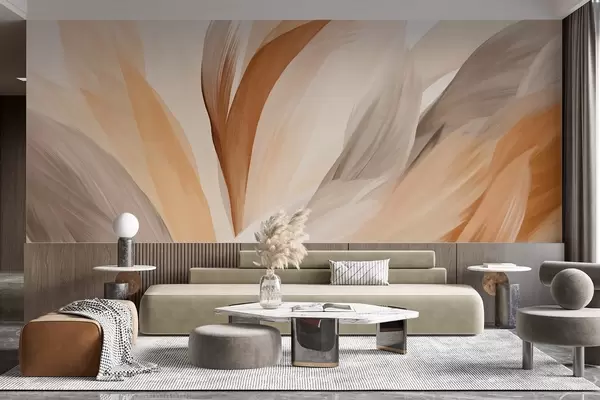 Papier peint Plumes abstraites texturées dans des tons bruns, blancs et gris et diverses nuances, se superposant sur un fond blanc. N° w09531