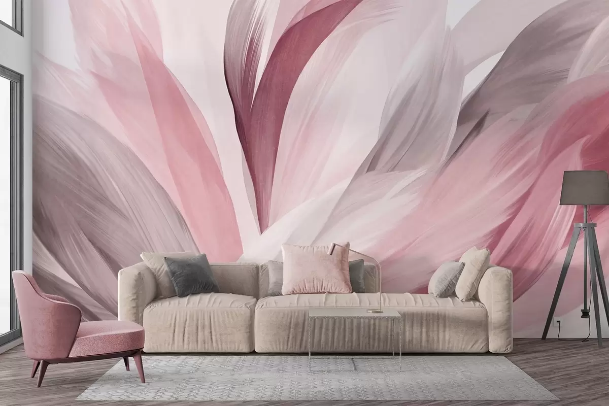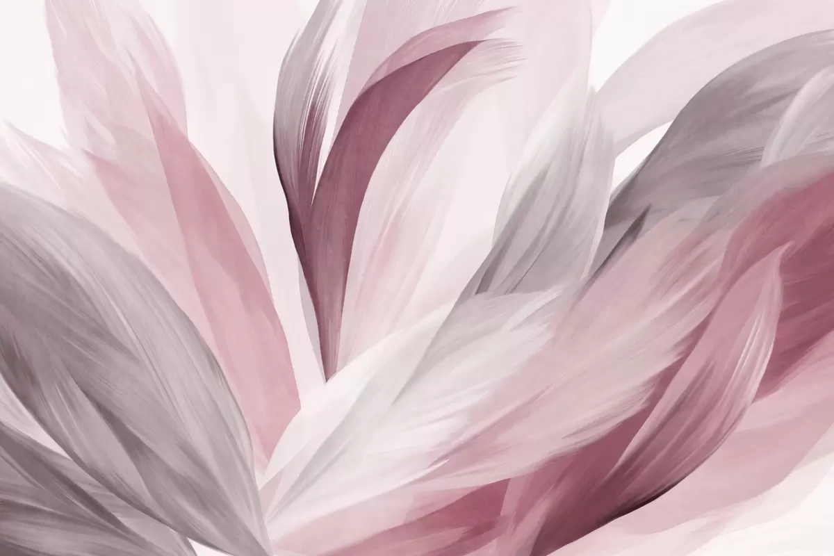 Papier peint Plumes abstraites texturées dans les tons rose, blanc, gris et diverses nuances, se superposant sur un fond blanc. N° w09531v2