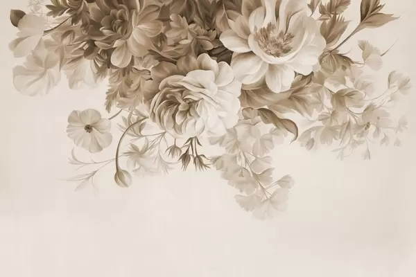 Papier peint Composition florale vintage avec des roses, des pivoines et d'autres fleurs texturées accompagnées de feuillage, sur un fond clair. N° w09532